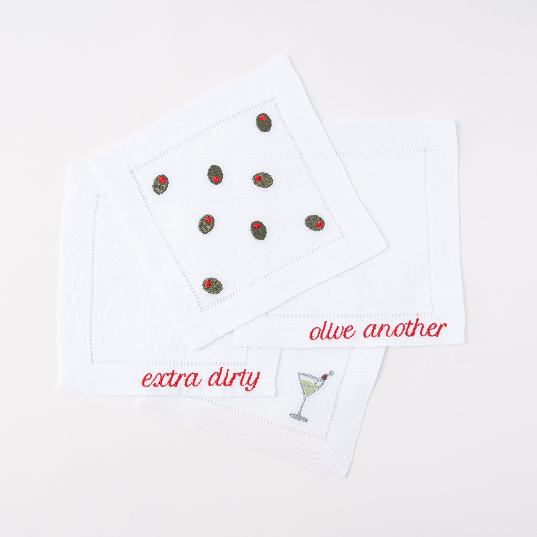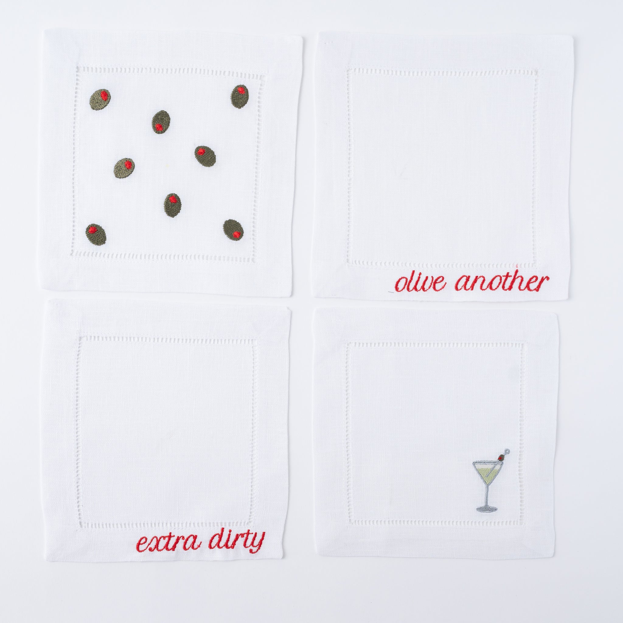 Raise a glass in style with the “MARTINI” Cocktail Napkins. Crafted from 100% white linen and embroidered in a range of vibrant thread colors, this set of four napkins brings a polished, modern edge to any cocktail hour.