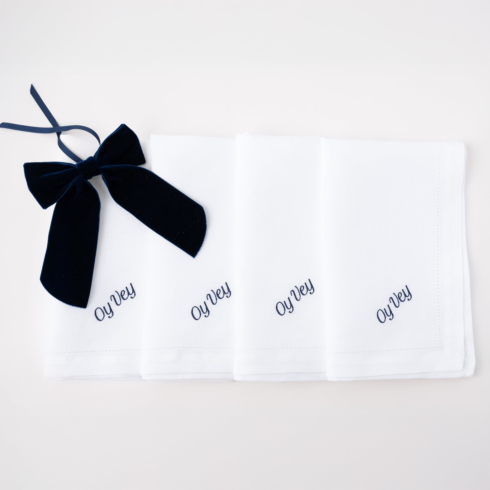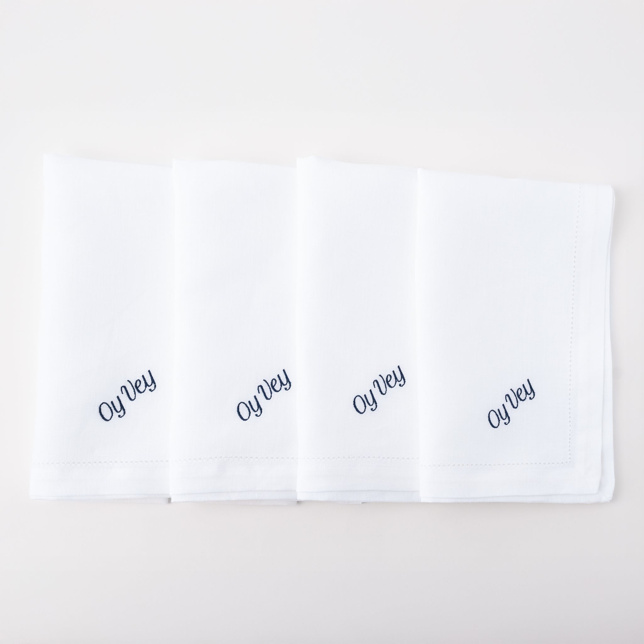 The OY VEY Dinner Napkins bring a touch of wit to the table without sacrificing sophistication. Crafted from 100% white linen set of 12 embroidered dinner napkins they balance classic elegance with modern personality.