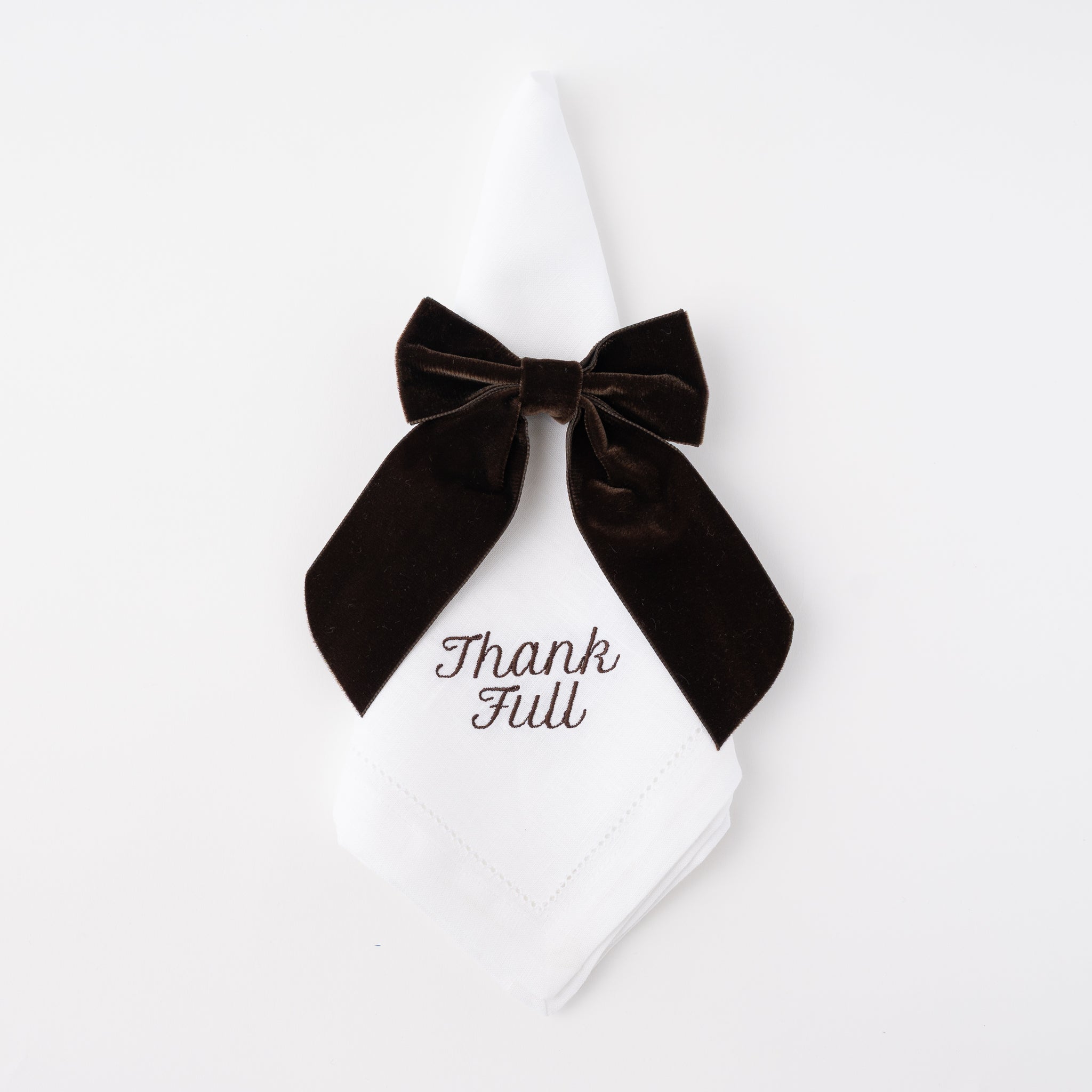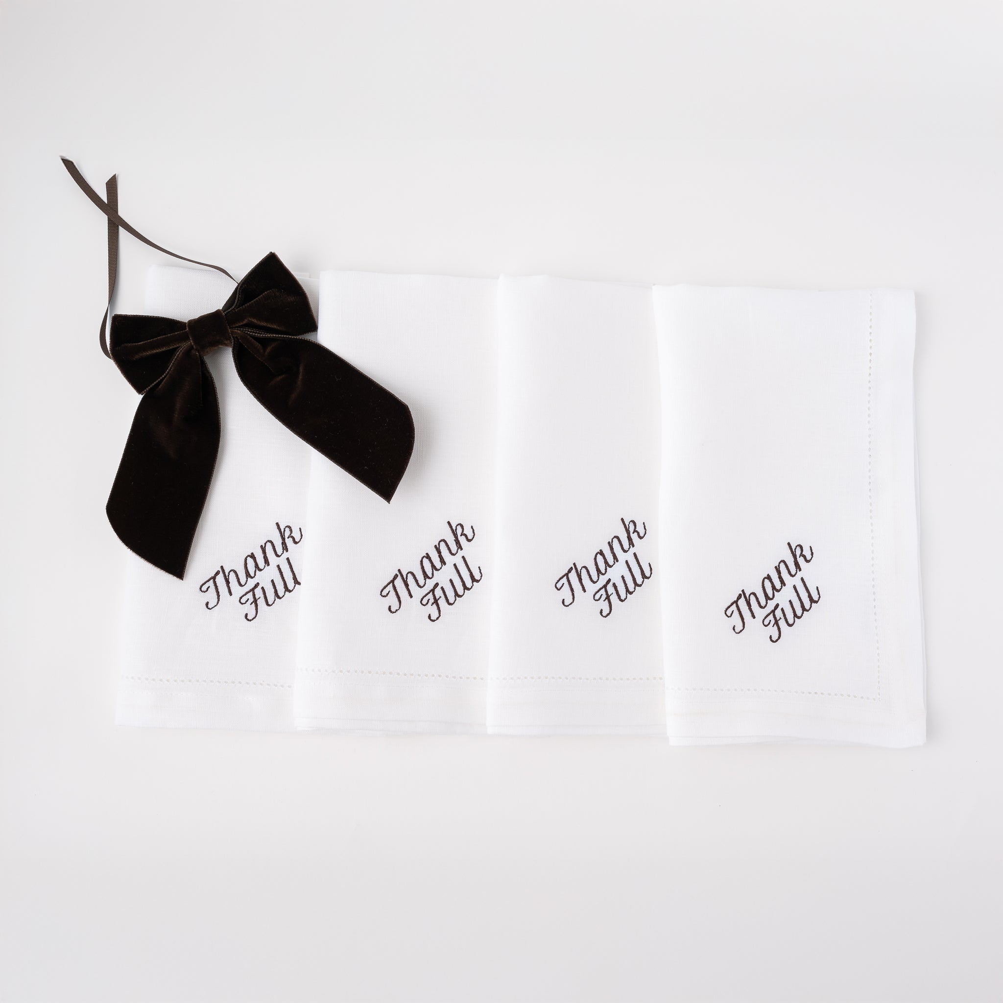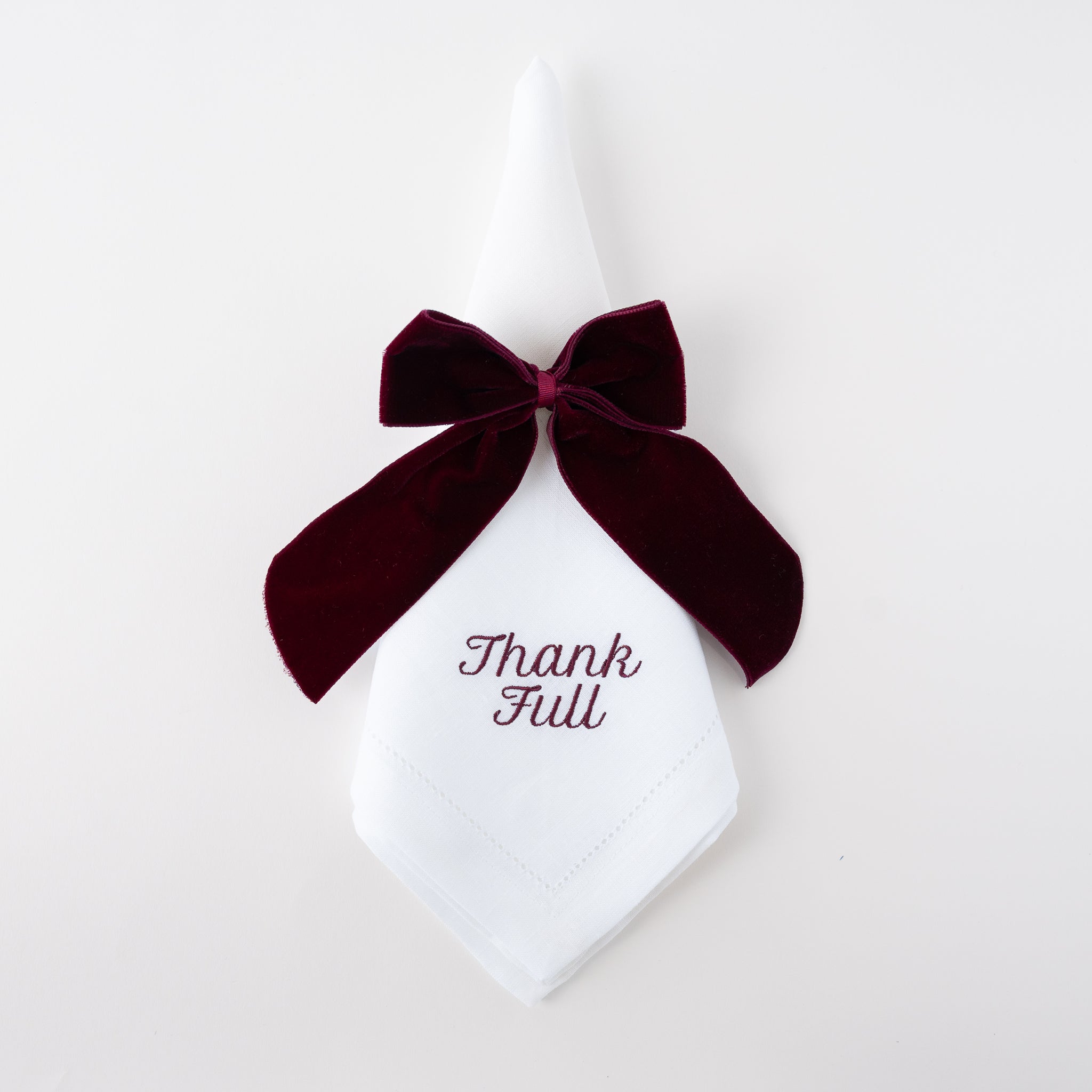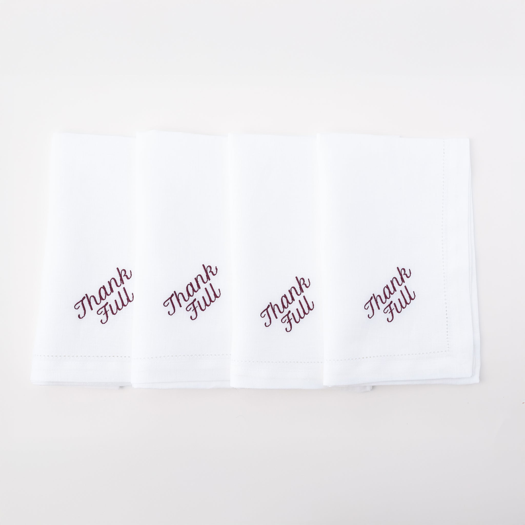 The THANK FULL Dinner Napkins are a refined take on gratitude at the table. Crafted from 100% white linen and embroidered in crisp red thread, this set of 12 dinner napkins pairs timeless elegance with a subtle, clever touch.