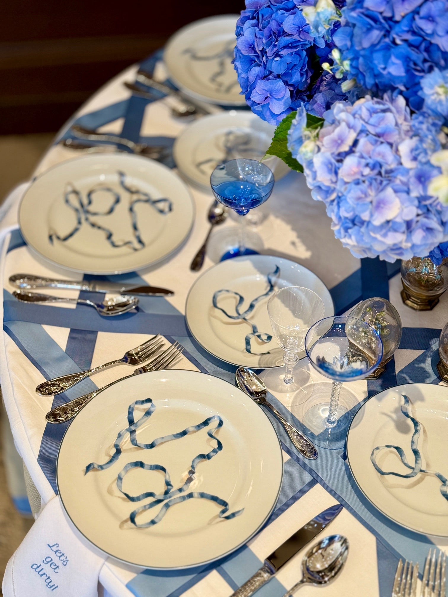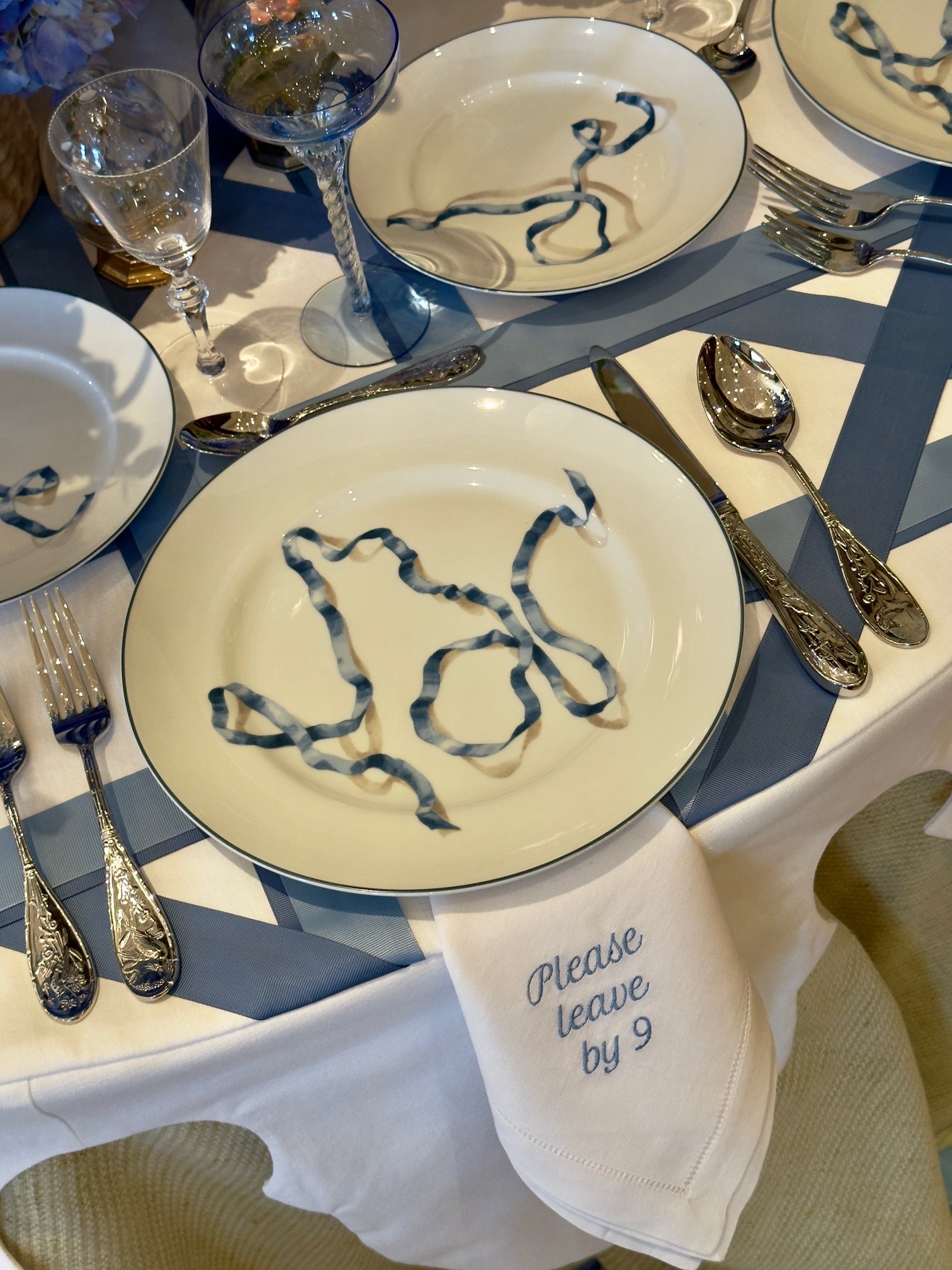 This exquisite, layered tablecloth features an elevated take on a classic design. The top layer showcases a delicate scalloped edge and blue ribbons intricately woven into a cane design. The base cloth, in a light pistachio basketweave fabric with a coordinating blue ribbon trim, provides additional texture and color to the overall curated design.
